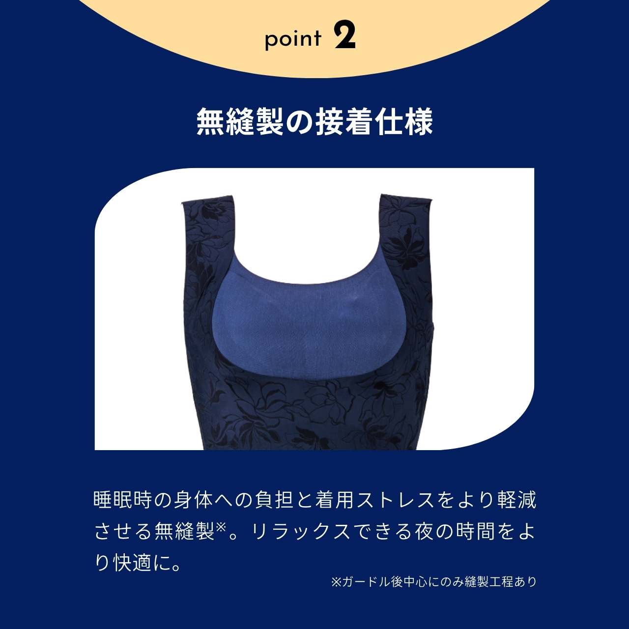 睡眠時の身体への負担と着用ストレスを軽減させる無縫製の接着仕様。360°どの方向にもスムーズに伸縮し、フィット感が抜群の「フレックスムーヴ®」を採用しています。