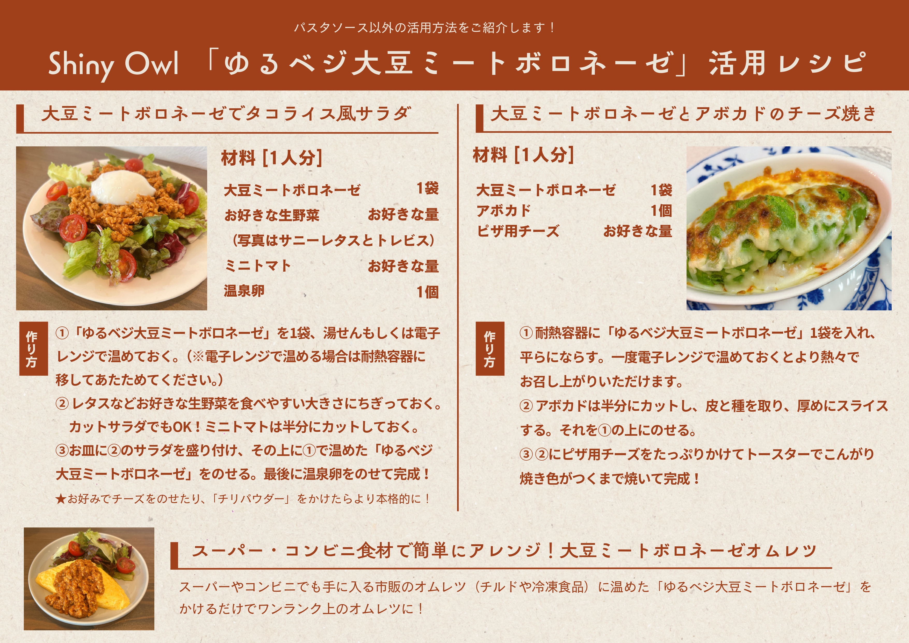 大豆ミート(国産)、野菜(玉葱、人参・セロリ)、白ワイン、トマトペースト、椎茸、オリーブオイル、にんにく、食塩、ナツメグ、タイム、セージ、ブラックペッパー、昆布だし(一部に大豆を含む)