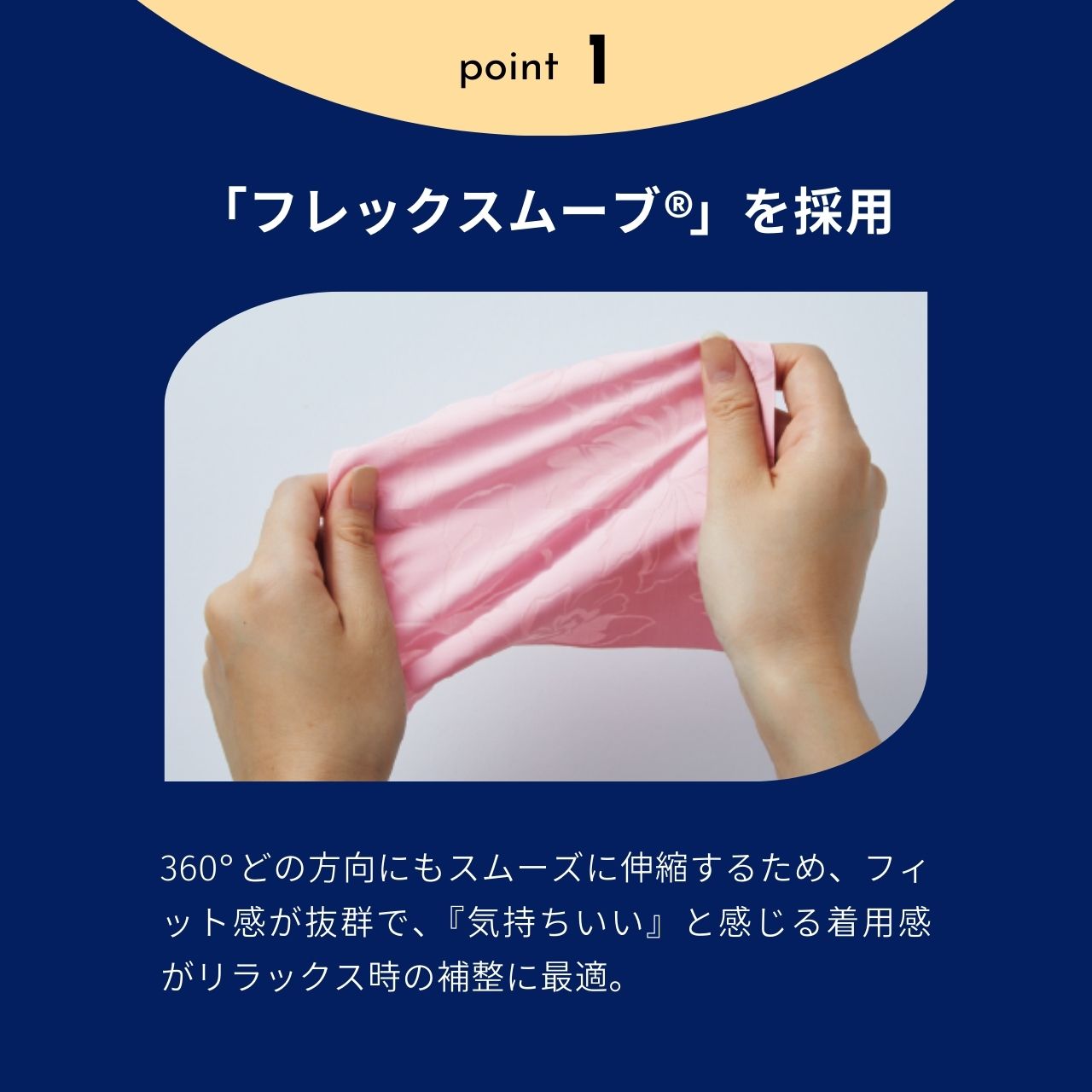 睡眠時の身体への負担と着用ストレスを軽減させる無縫製の接着仕様。360°どの方向にもスムーズに伸縮し、フィット感が抜群の「フレックスムーヴ®」を採用しています。