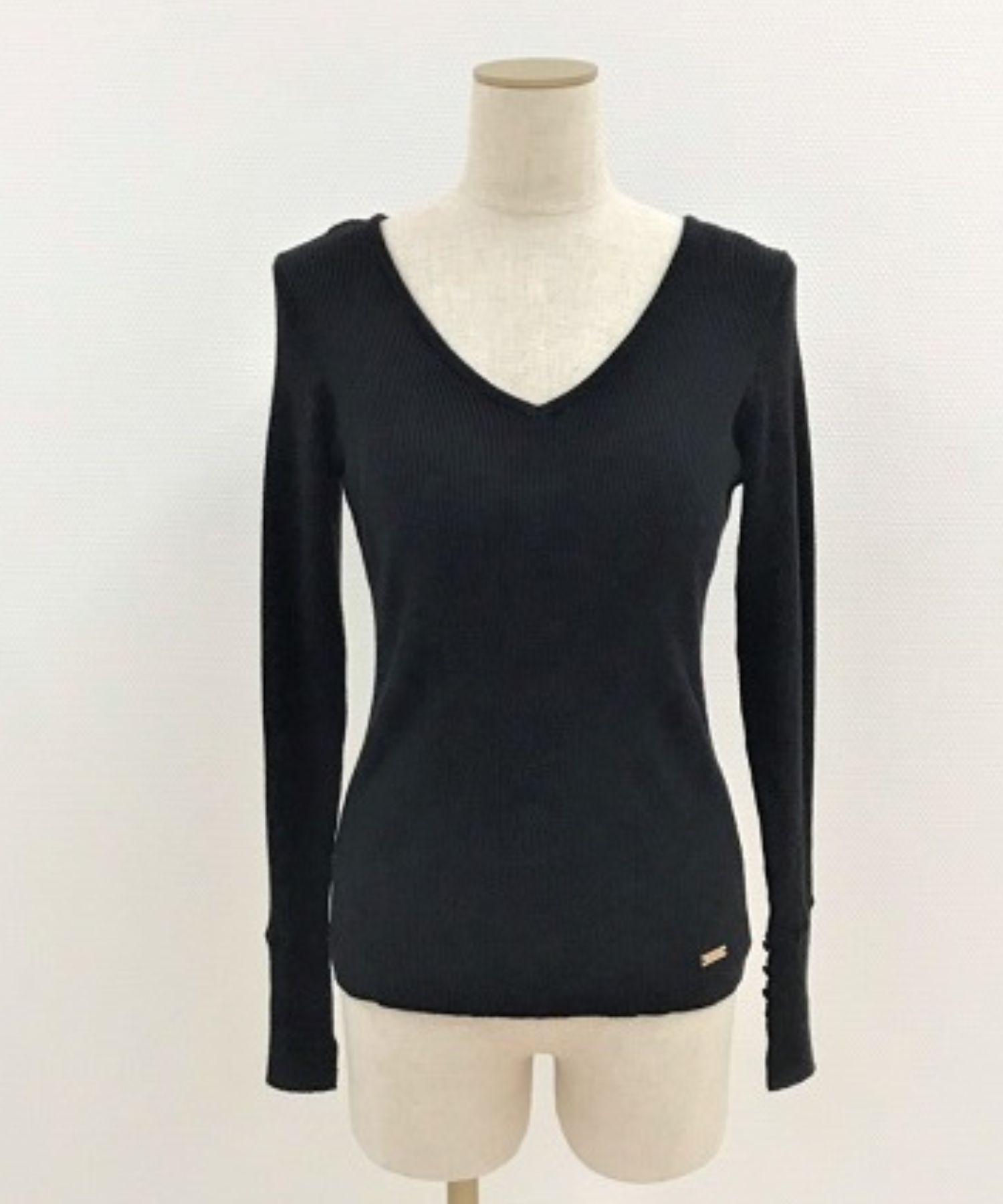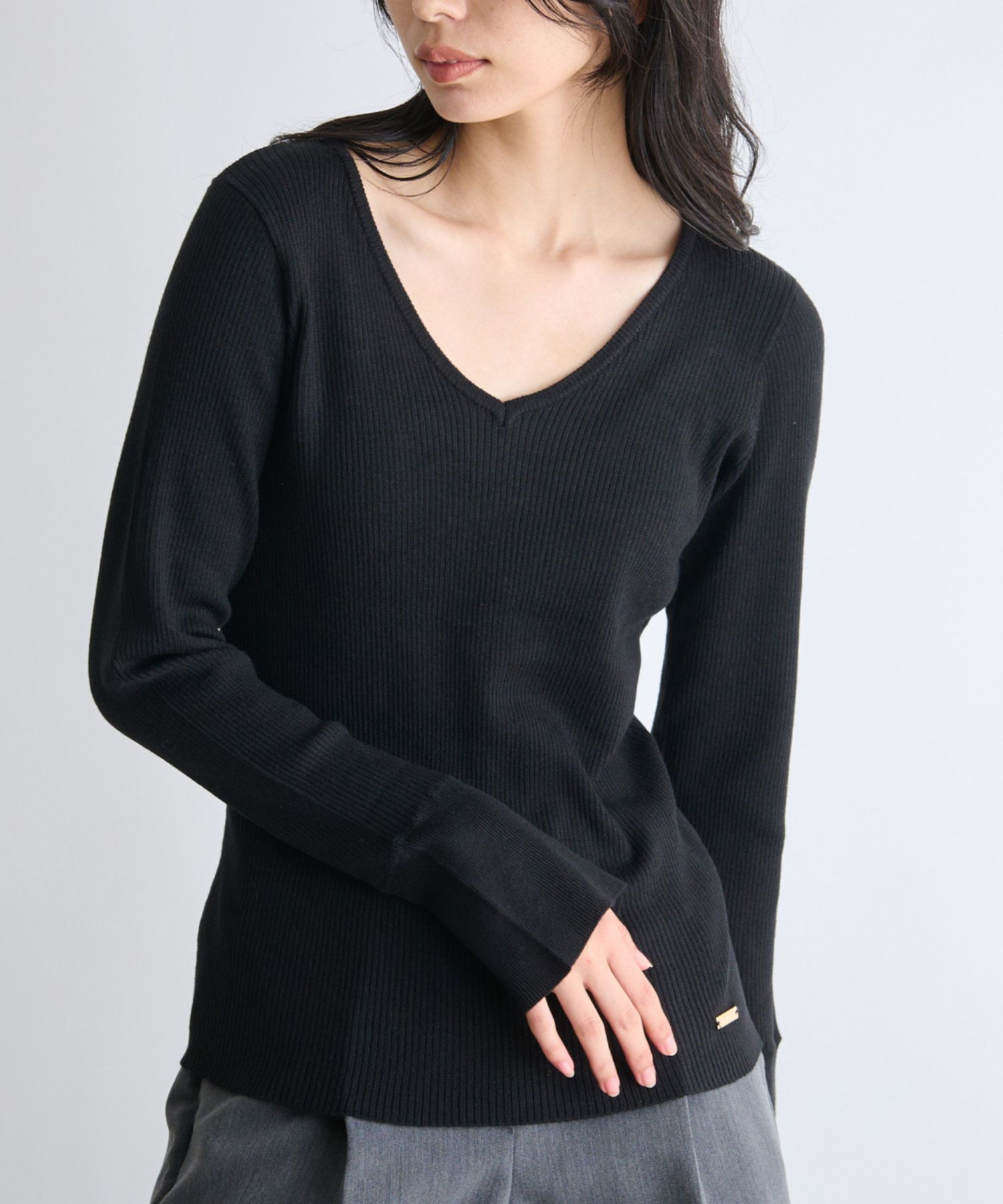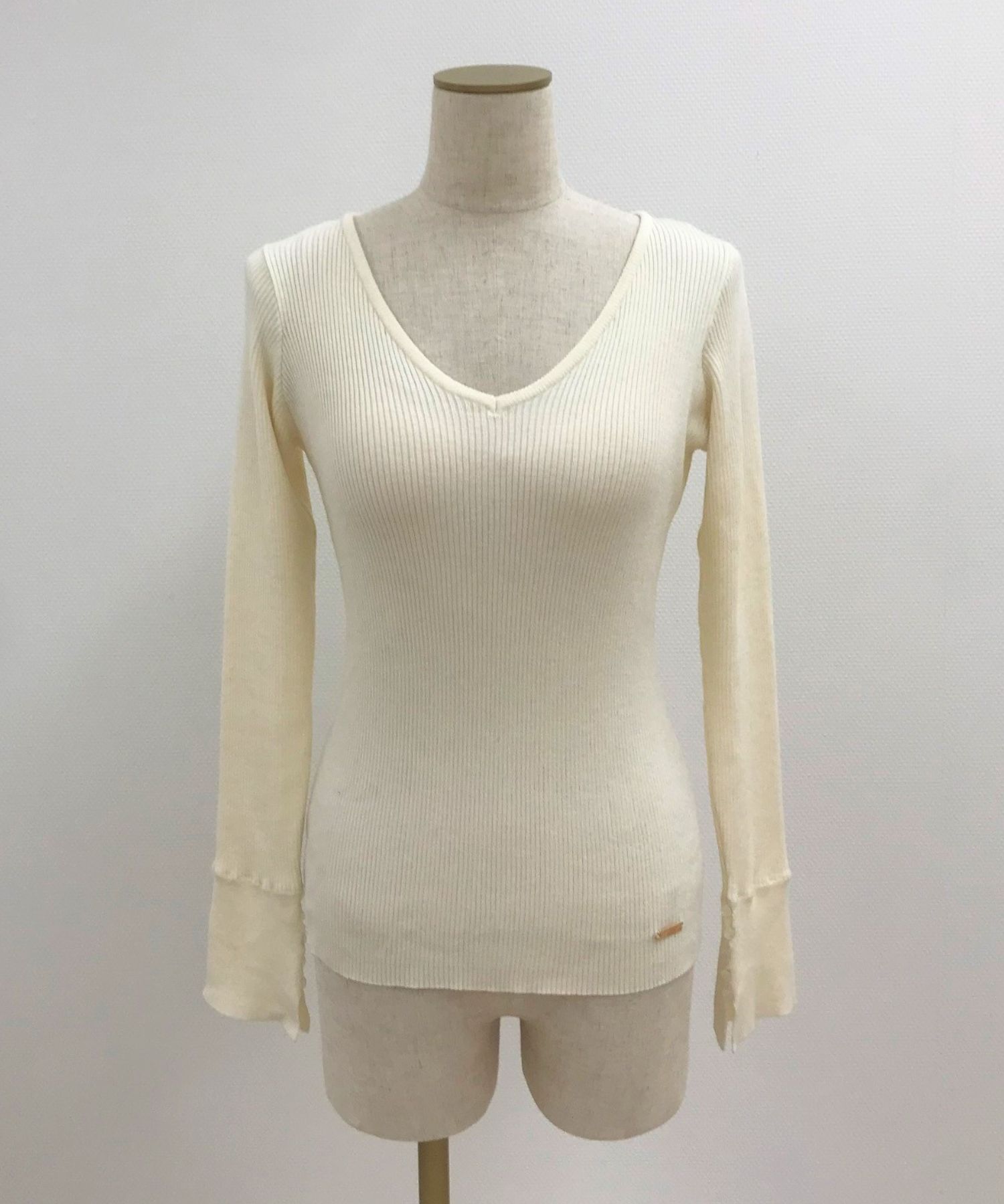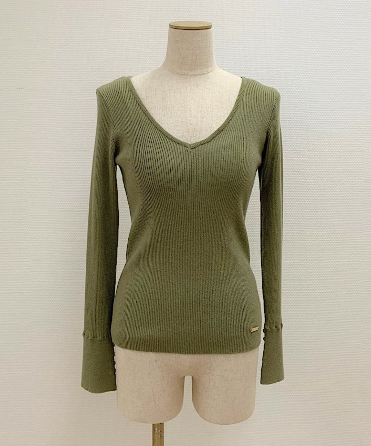 植物性由来成分で安心『沖縄産アロエベラ』糸を使用した肌に負担の少ない優しい素材。深めのVネックがデコルテを綺麗に見せてくれるニットはシンプルながらも美シルエットに拘った1枚。袖口はフレアにし、ボタンを沢山作ける事でフェミニンな印象に。高級感あるゴールドのネームプレートもポイント。