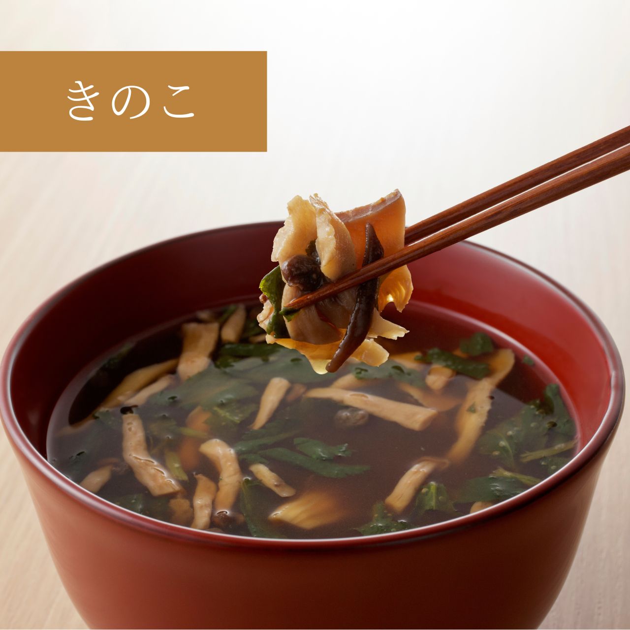 きのこ:まいたけ水煮(国内製造)、ぶなしめじ水煮、えのき茸水煮、豆みそ、米みそ、デキストリン、みつば、でん粉、かつお節エキス、乾燥きくらげ、乾燥しいたけ、昆布エキス、ゼラチン、しいたけエキス/調味料(アミノ酸等)、酸化防止剤(V.E)、(一部に大豆・ゼラチンを含む)