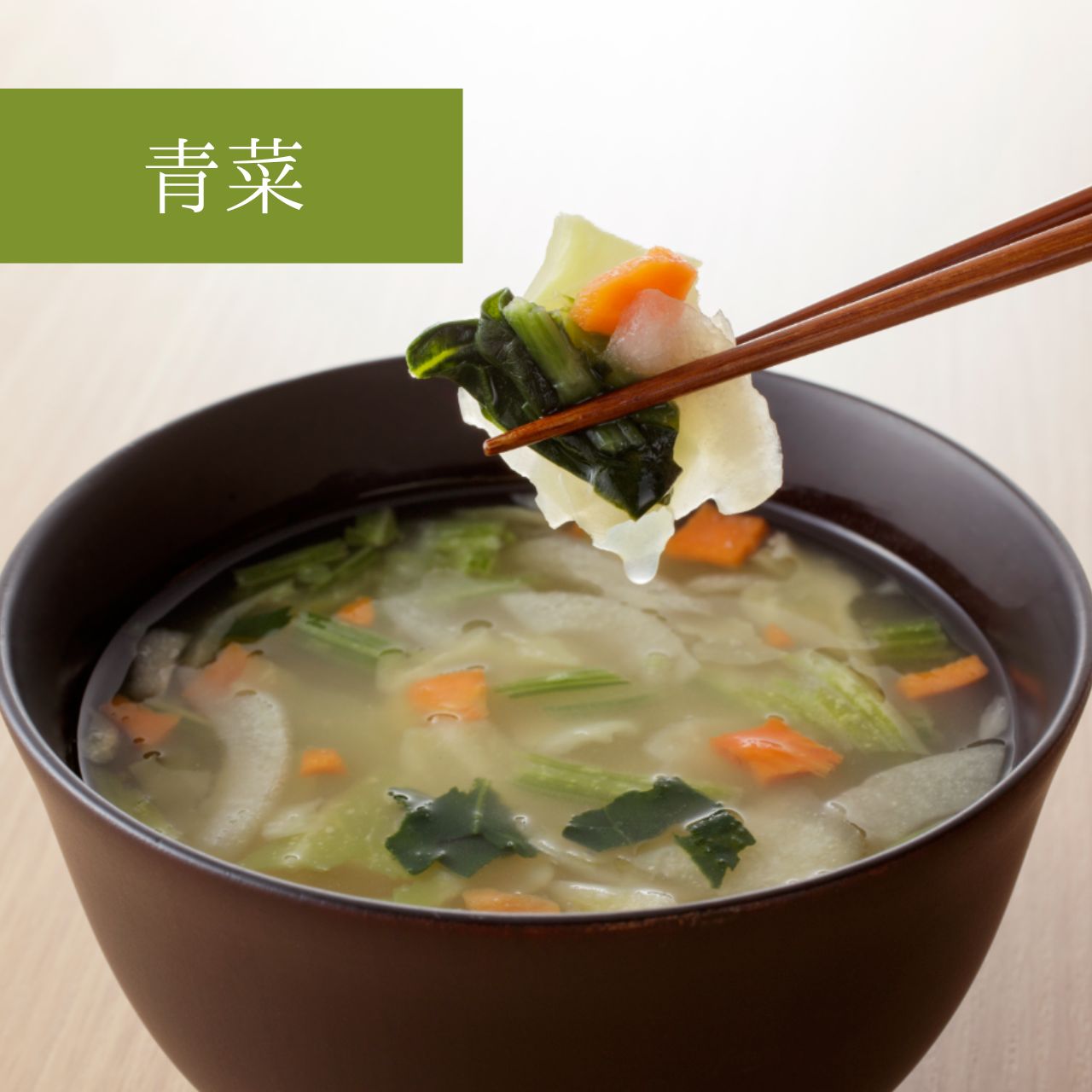 青菜:ほうれん草(中国産)、たまねぎ、麦みそ、米みそ、乾燥キャベツ、デキストリン、でん粉、煮干粉末、乾燥にんじん、焼きあごだし、昆布エキス、酵母エキス、煮干エキス、小麦発酵調味料/調味料(アミノ酸等)、酸化防止剤(V.E)、(一部に小麦・乳成分・大豆を含む)