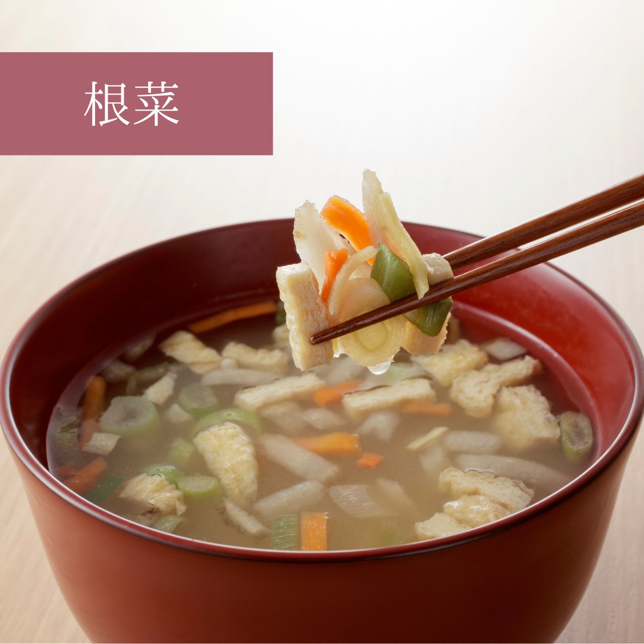根菜:米みそ(国内製造)、九条ねぎ、米こうじ加工品、油揚げ、デキストリン、乾燥ごぼう、でん粉、しょうが、乾燥にんじん、砂糖、焼きあごだし、昆布エキス、ごぼうパウダー、小麦発酵調味料、かつお節粉末、ゼラチン/調味料(アミノ酸等)、酸化防止剤(V.E)、(一部に小麦・大豆・ゼラチンを含む)