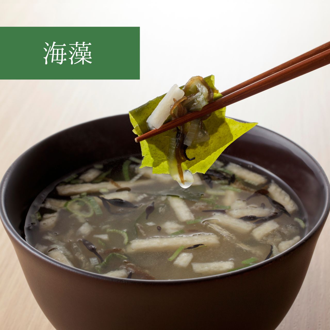 海藻:米みそ(国内製造)、もずく、長芋、デキストリン、ねぎ、でん粉、昆布エキス、かつお節エキス、寒天、わかめ、ひじき、あさりエキス調味料、しいたけエキス、ゼラチン/調味料(アミノ酸等)、酸味料、酸化防止剤(V.E)、(一部に大豆・やまいも・ゼラチンを含む)