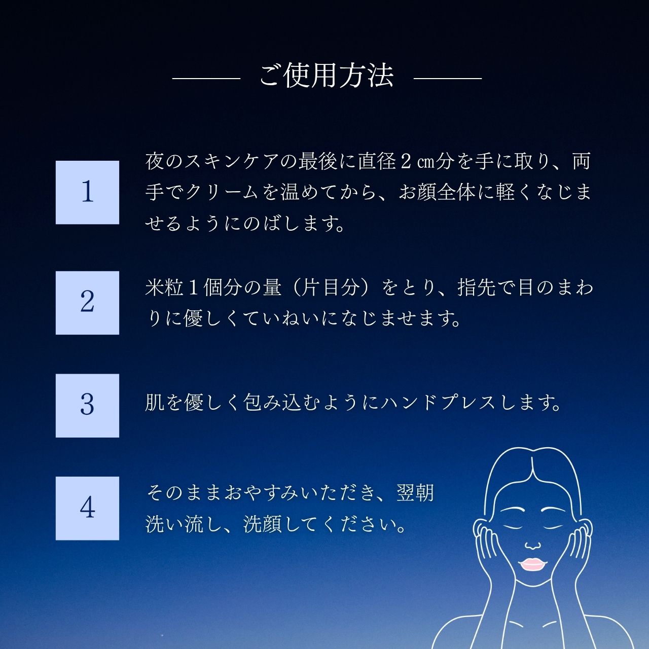 1.毎日の夜のお手入れの一番最後に、直径2cm分を手に取り、お顔全体に軽くなじませるようにのばします。