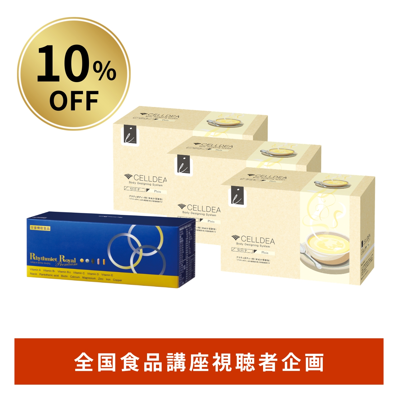 ☆全国食品講座視聴者企画☆ セルディア3箱とリズミエット ロイヤル プレミアム1箱の4点セットが、通常価格63,180円(税込)から10%OFF! 講座での学びをさっそく実践したいあなたを応援します♪ 【販売期間】 2026年3月7日(土) 9:30~2026年3月21日(土) 21:59 こちらのセットにさらにオレアスヴェルト プレミアムを追加した「2週間最強セット」も販売中! ご購入はこちらから